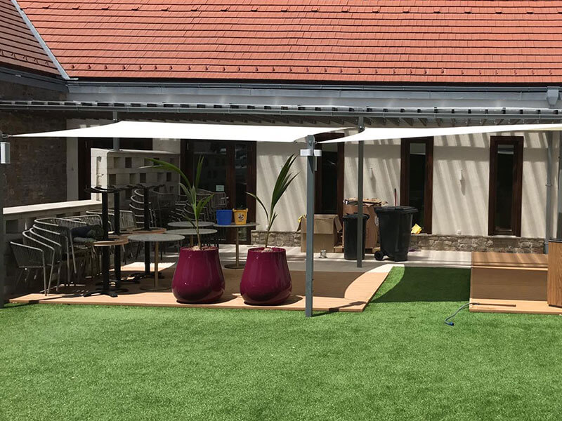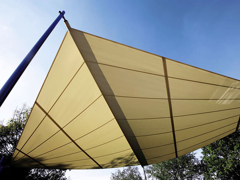 A nap járásának megfelelően célszerűen elhelyezhető a sarokpontokon megfeszített fix vagy állítható textilárnyékoló.